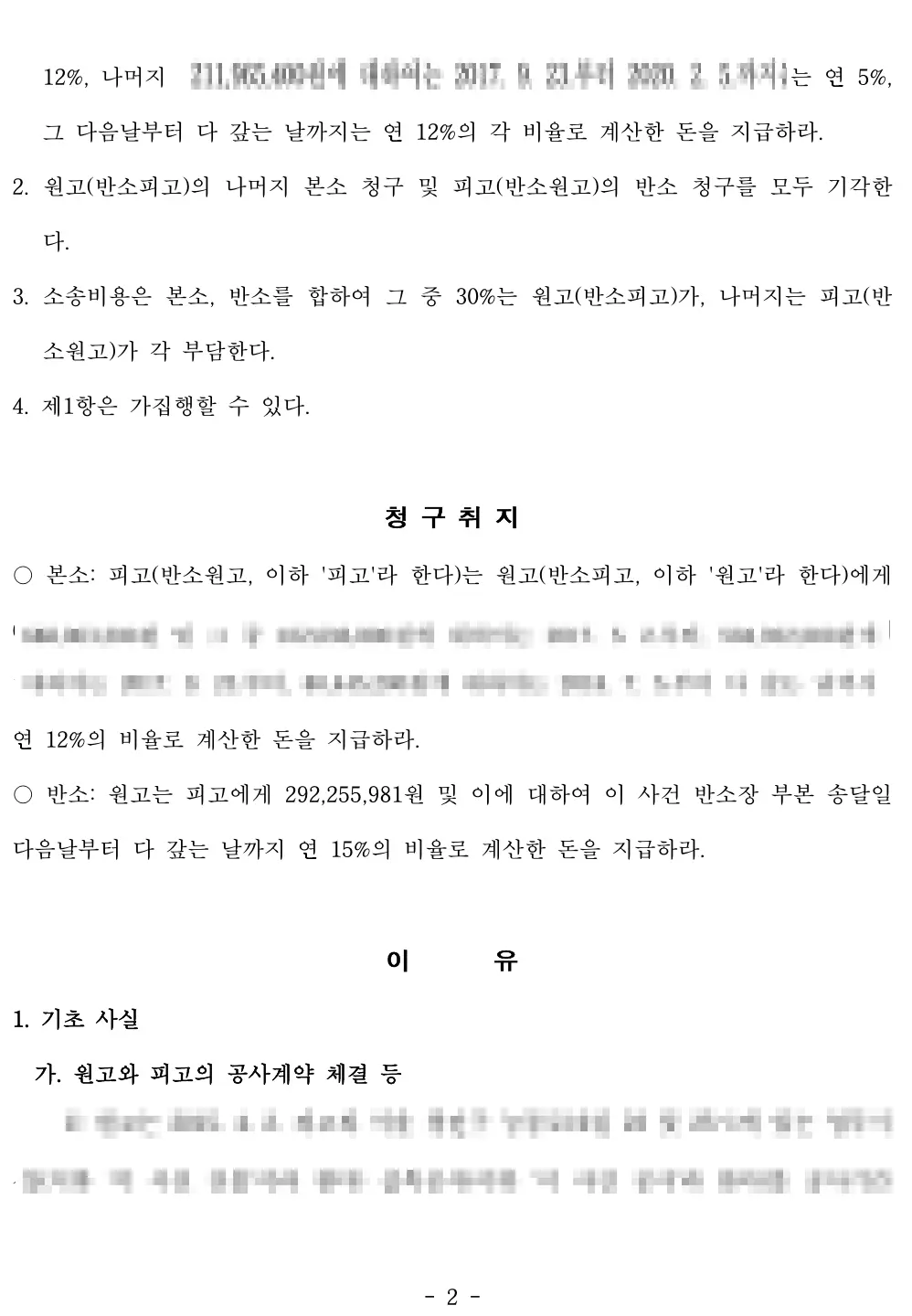 법률사무소 기린은 피고가 계약에 따라 공사를 수행해야 함에도 불구하고 일방적으로 공사를 중단하여 계약을 위반하였고 이에 따른 재공사 비용 등 의뢰인에 손해 발생에 따른 배상하여야 한다는 내용으로 소장을 제출하였습니다.