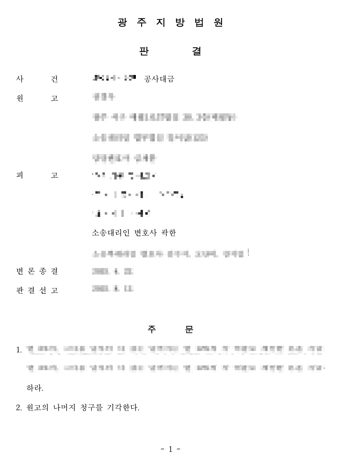 의뢰인(피고) 건설 발주사로써 숙박시설 신축공사를 시행하였습니다. 시공사는 일부 공정을 하도급으로 주었고, 원고는 하도급업체의 임원 겸 개인사업자로 참여하고 있었습니다.